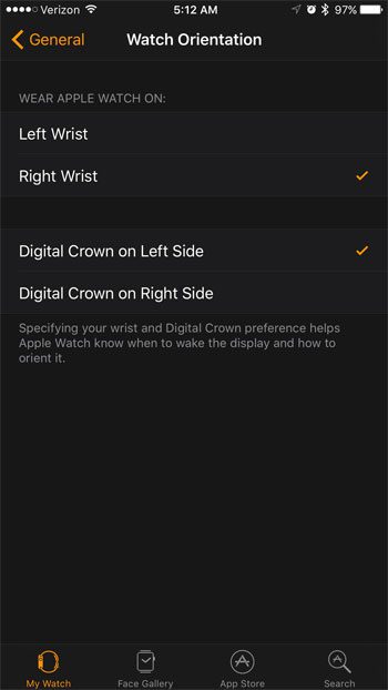 iPhoneでApple Watchを最初に設定したとき、デバイスを着用する手首と、デジタルクラウンが配置された側面を選択する必要がありました。これにより、Apple Watchが顔を自動的に向けて、見ることができます。
