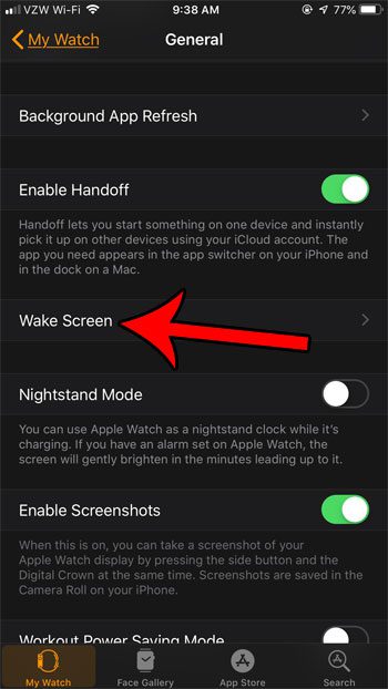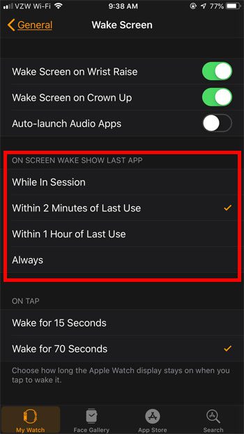 ステップ5:下のオプションをタップします画面上のウェイクショーの最後のアプリこれは、最後に使用した後、時計をどのくらいの期間アプリに開いてもらいたいかに対応しています。