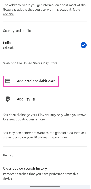 ステップ5:下の支払い方法をタップします[国]プレイストアに切り替えます'カテゴリ。