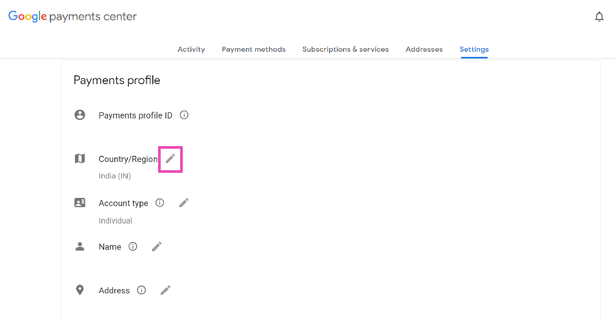 ステップ4:クリックします鉛筆(編集)アイコン国/地域の隣。