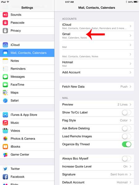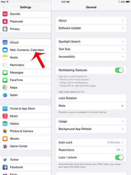 ステップ2:タッチしますメール、連絡先、カレンダー画面の左側にあるオプション。
