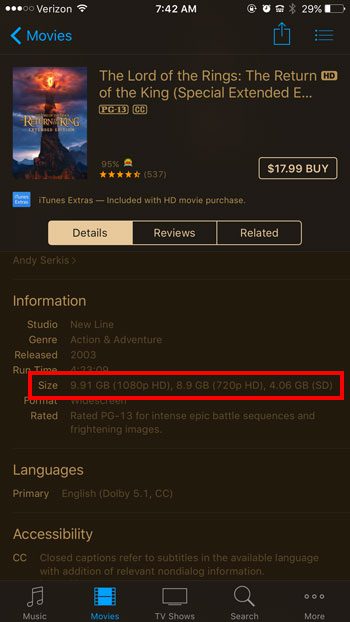 iPhoneのiTunesムービーのファイルサイズを確認する方法がわかったので、この情報を使用して、ダウンロードを開始する前に十分なスペースがあるかどうかを判断できます。