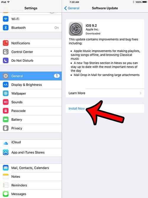 - 利用可能な更新がある場合、この画面に表示されます。 iOS 9.2アップデートは、下の画像でiPadで利用できます。