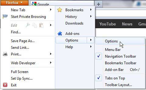 このタブをクリックすると、Firefox内で設定できるすべてのオプションを含む新しいメニューが展開されます。ただし、このチュートリアルの目的のために、クリックする必要がありますオプション別のメニューを展開するには、クリックしますオプションまた。