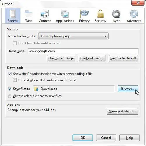 で一般的な選択したタブ、クリックしますブラウズの右側のボタンダウンロードセクション。