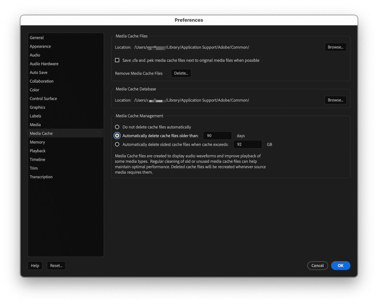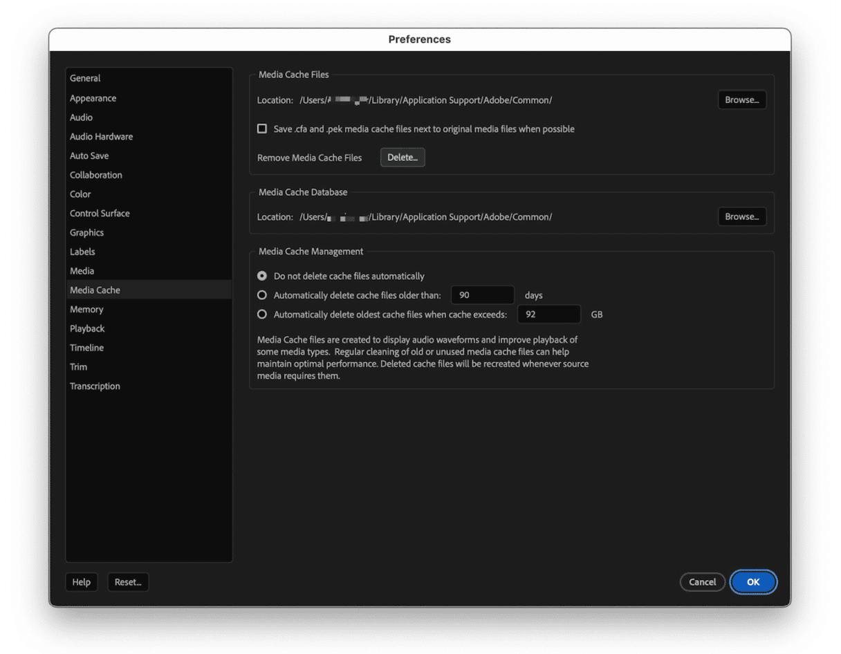 スタートアップディスクにキャッシュファイルを保存したくない場合は、外部ディスクに保存できますが、Premiere Proを使用するときはそのディスクを接続することを忘れないでください。 [設定]> [メディアキャッシュ]で、[場所の横にある[参照]をクリックします。ファイルを保存する場所に移動し、そのフォルダーを選択します。
