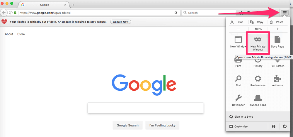 プライベートモードをアクティブにするには、右上の3つの裏地のアイコンを選択し、「新しいプライベートウィンドウ」を選択します。また、ファイル>新しいプライベートウィンドウに移動することもできます。プライベートウィンドウには紫色のマスクアイコンがあります。