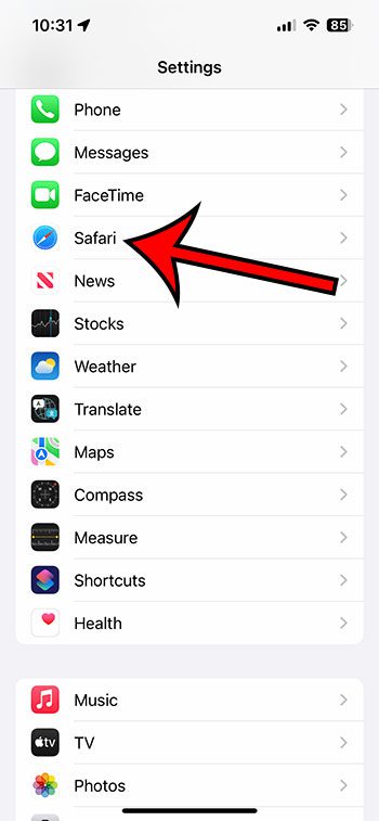 ステップ2:下にスクロールして選択しますサファリこのメニューからオプション。