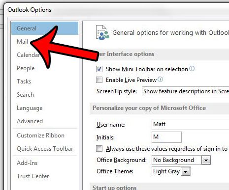ステップ4:クリックします郵便の左列のタブOutlookオプションウィンドウ。