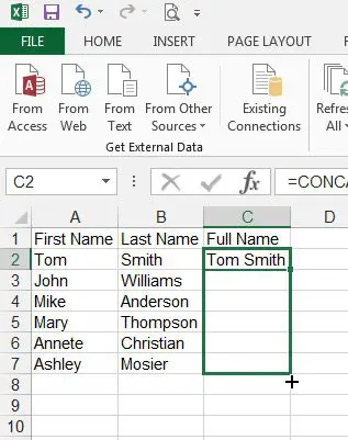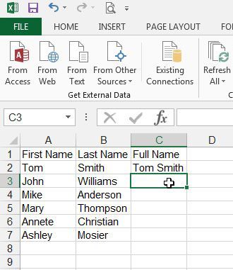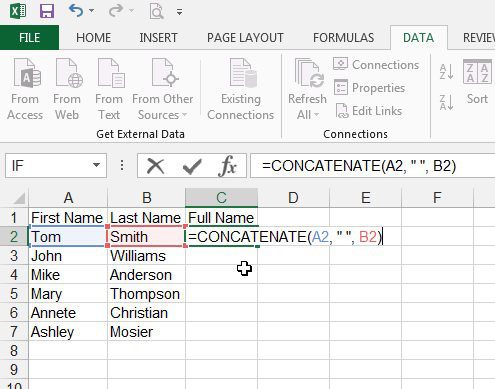 幸いなことに、Excel 2013では最初の名前と姓を1つのセルに結合できるように、データを組み合わせてデータを組み合わせるための式があります。