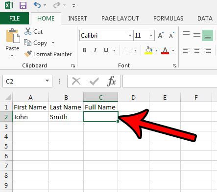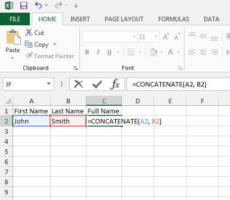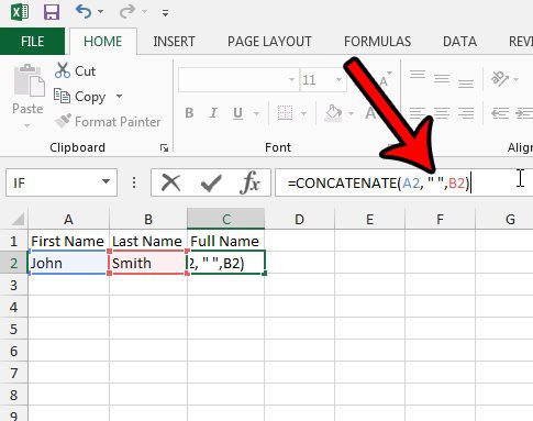 Excelがそれらのセルにあるものを正確に組み合わせることに気付くかもしれません。上記の私の例では、その式はジョンスミスをもたらします。残念ながら、それはこれの望ましい結果ではないので、式を調整する必要があります。式を変更した場合=CONCATENATE(A2, " ", B2)次に、目的の「ジョンスミス」結果が表示されます。その式には引用符の間にスペースがあることに注意してください。