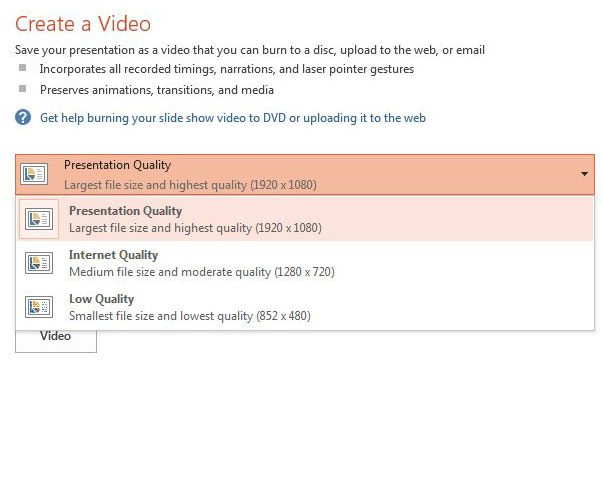 - プレゼンテーション品質- 1920 x 1080ピクセル。これは、プレゼンテーションから作成できる最高品質のビデオであり、大画面で表示する場合に適しています。これにより、最も高いファイルサイズも作成されます。