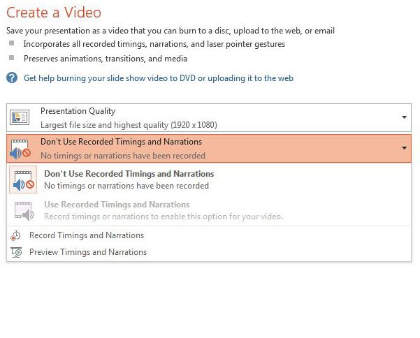 ステップ6:クリックします記録されたタイミングとナレーション既存のプレゼンテーションのタイミングとナレーションを処理する方法を選択するボタン。また、このドロップダウンメニューからこれらのものを作成することも選択できることに注意してください。