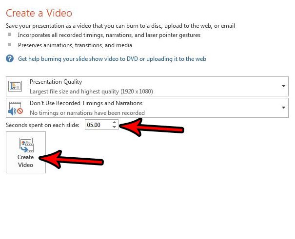 ステップ7:値を調整します各スライドに費やされた秒フィールド、次にクリックしますビデオを作成しますボタン。