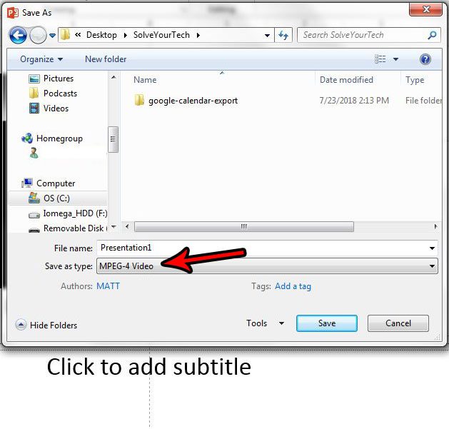 ステップ8:変換されたMP4ファイルを保存する必要があるコンピューターの場所を参照してください。ファイルに名前を付け、クリックします。タイプとして保存しますドロップダウンメニューを選択して選択しますMPEG-4オプション、次にクリックします保存ボタン。