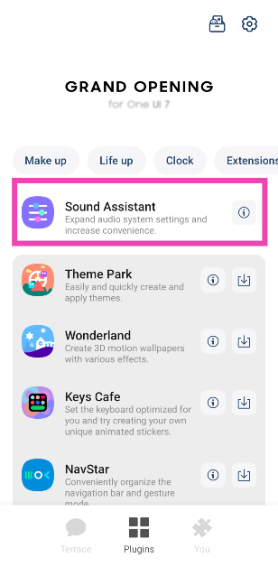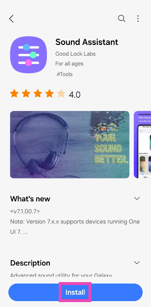 ステップ1:Galaxy Storeに行きますダウンロードサウンドアシスタントアプリ。このアプリは、Good Lockアプリのプラグインとして機能します。