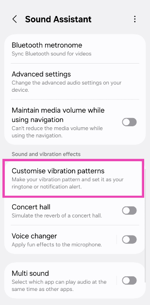 Samsungユーザーは、Good LockアプリでSound Assistant Pluginを使用して、着信音と通知のカスタム振動パターンを作成できます。行きますサウンドアシスタント>振動パターンをカスタマイズします、プラスアイコンを押して、画面をタップして触覚パターンを作成します。