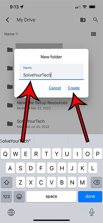 ステップ6:新しいフォルダーの名前を入力し、次にタップします作成するボタン。