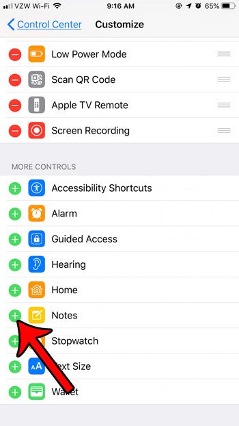に行くことにより、iPhoneのコントロールセンターにノートアプリを追加できます設定>コントロールセンター>次に、隣の緑 +をタップしますメモ。その後、ロック画面の右上隅からスワイプして、メモ新しいメモを作成するアイコン。