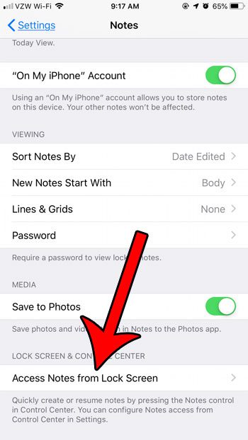 ステップ8:メニューの下部までスクロールして、ロック画面からのアクセスノートボタン。