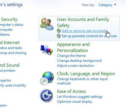 [スタート]ボタンをクリックし、[コントロールパネル]をクリックしますステップ2:クリックしますユーザーアカウントと家族の安全リンク。