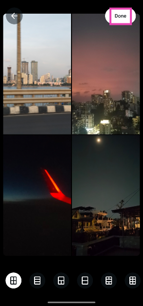 WhatsAppの更新ページに移動し、[ステータス]> [レイアウト]をタップし、電話のライブラリから最大6つの画像を選択します。次のページには、画面の下部に6つのレイアウトオプションが表示されます。選択した写真の数に応じて1つのオプションを選択し、「done」を押します。