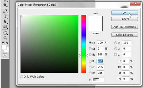 ステップ4:クリックします前景の色ウィンドウの左側にあるツールボックスのボックス、カラーピッカーの左上の角をクリックして色を選択し、クリックします。わかりましたボタン。
