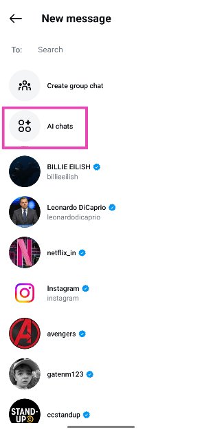 Instagram DMSに移動し、画面の右上隅にある鉛筆アイコンをタップし、AIチャットを選択し、リストからAI文字を選択します。