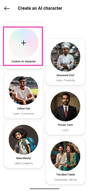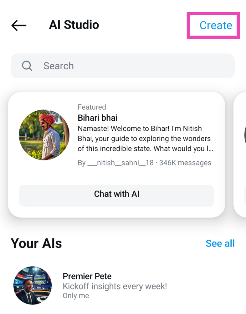 Instagram DMSに移動し、画面の右上隅にある鉛筆アイコンをタップし、AIチャット> AI文字の作成、そしてキャラクターの説明を入力します。次のページで、「AI Characterとのチャット」をタップします。
