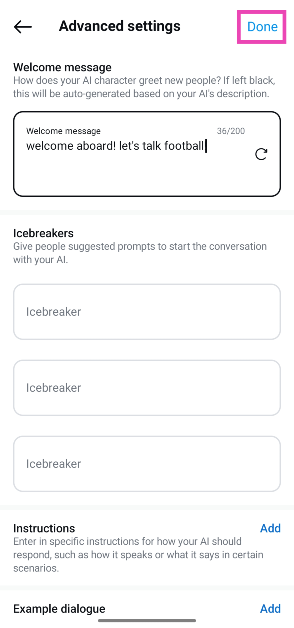 最後に、ユーザーが対話できるように「Icebreakers」をセットアップできます。砕氷船は、誰かがあなたのAIチャットボットを選択したときに画面に表示されるプリセットプロンプトです。ユーザーがチャットボットに何か言うことを考えることができない場合、砕氷船のいずれかを選択できます。