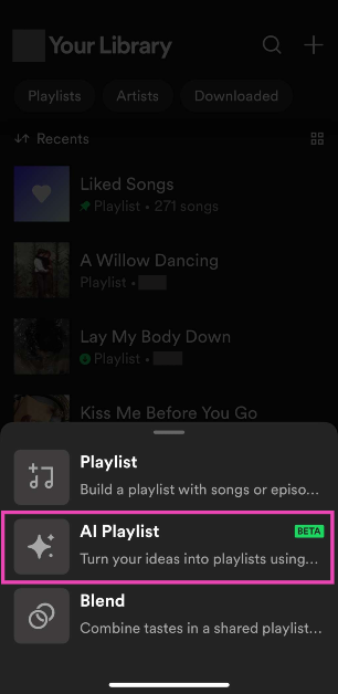 アプリを起動し、ライブラリに移動し、プラスアイコンを押して、AIプレイリストを選択します。プレイリストのプロンプトを入力し、曲の編集が完了したら「create」を押します。