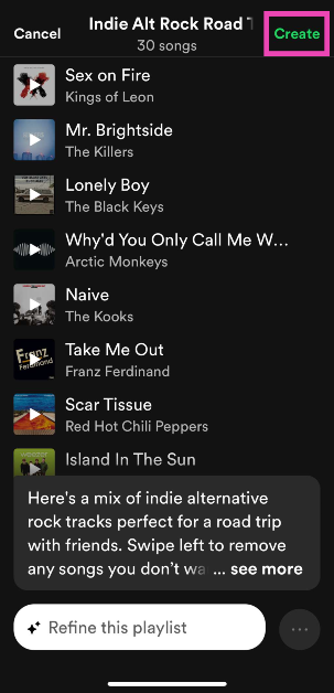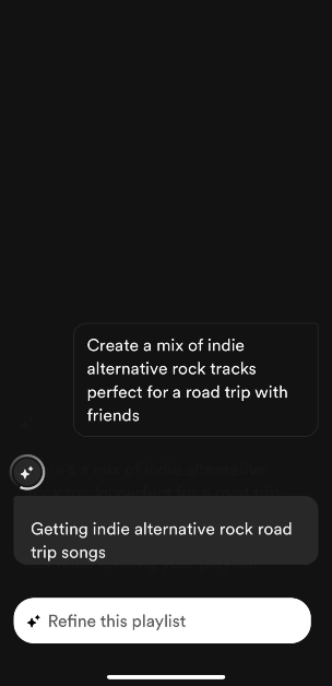 ステップ5:Spotifyはaを生成しますプレイリストプロンプトに基づいています。あなたはできる編集このプレイリストの曲は、入力してさらに洗練しますフォローアッププロンプト。