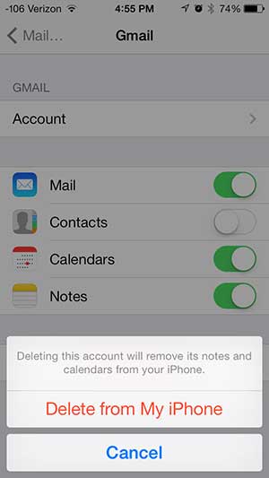 ステップ5:タッチしますiPhoneから削除しますもう一度ボタンを合わせて、iPhoneからGmailアカウントを削除することを確認します。