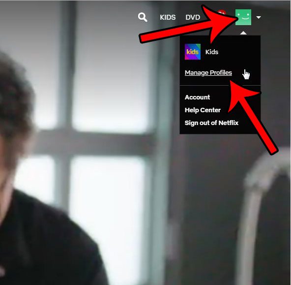 または、netflixアカウントのプロファイルに既にログインしている場合は、ウィンドウの右上にあるプロファイルアイコンをクリックして、選択してから選択できます。プロファイルを管理しますオプション。