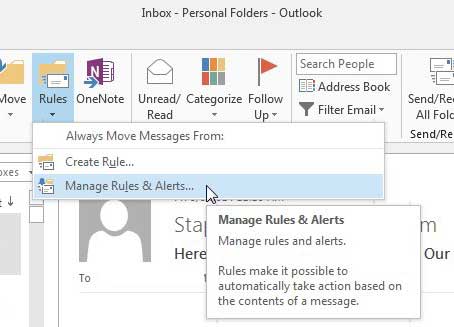 幸運なことに、Outlook 2013は、特定のメッセージを移動しているフィルターを作成して削除して削除する機能を提供します。