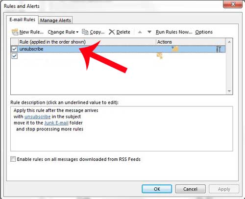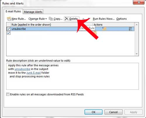 このプロセスは、Outlookからルールを完全に削除する予定です。一時的にルールを停止したい場合は、ルールの左側にあるボックスをクリックできます。ステップ3以下にチェックマークを削除します。
