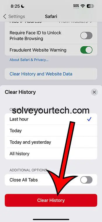 Safariの設定では、「明確な履歴とWebサイトのデータ」を探して、それをタップします。ポップアップが表示され、いくつかの設定を選択して決定を確認するように求めます。 「クリア履歴」をもう一度タップし、browsingの履歴とともにクッキーがクリアされます!