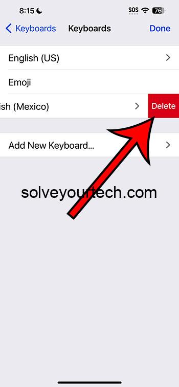 さて、取り除きたいキーボードを見つけてください。視界に入ったら、キーボードの名前を左にスワイプします。右側に赤い「削除」ボタンが表示される必要があります。先に進み、「削除」をタップすると、キーボードがデバイスから削除されます。