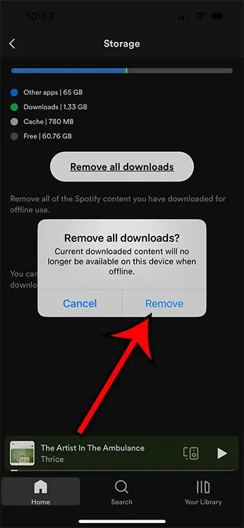 iPhoneですべてのSpotifyダウンロードを削除するには、に行く必要がありますSpotify>家>ギアアイコンをタップ> [選択]をタップしますストレージ>タップしますすべてのダウンロードを削除します>タップします取り除く。