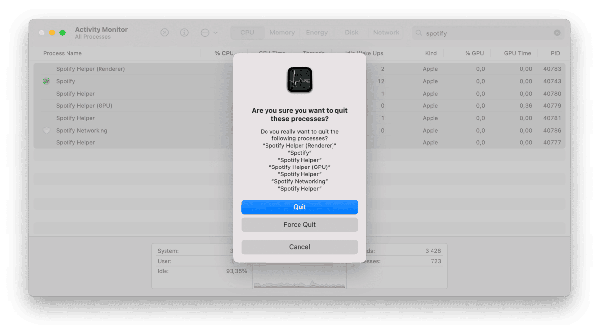 - 「Spotify」のアクティビティモニターを検索し、結果に実行中のプロセスがある場合は、Quitプロセスボタン(x)を使用してそれらを終了します。