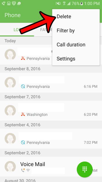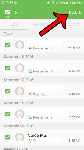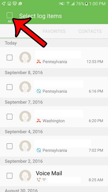 ステップ4:単語の上の緑色のボックスをタップします全て画面の左上隅。これにより、この画面のすべての呼び出しが選択されます。一部の呼び出しのみを削除する場合は、代わりにそれらの各呼び出しを手動で選択します。