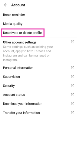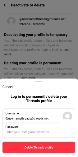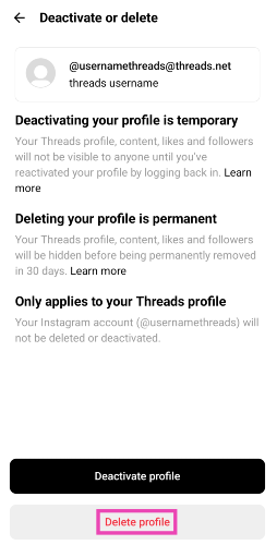 あなたに行きますスレッドプロファイル画面の右上隅にあるメニューアイコンをタップしてから、選択しますアカウント>プロファイルを非アクティブ化または削除>プロファイルを削除します。アカウントのパスワードを入力して、削除プロセスを確認します。