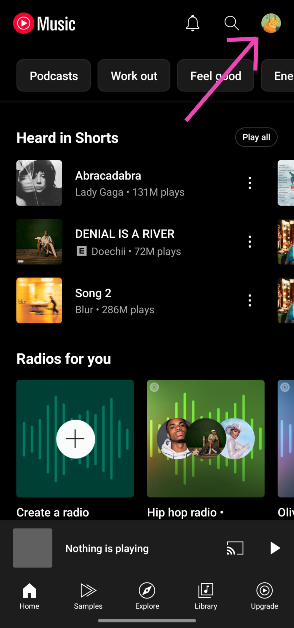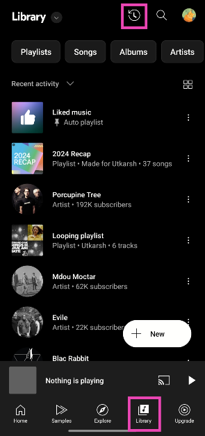 [ライブラリ]タブに移動し、タイマーでアイコンをタップして矢印を巻き戻すことで、YouTubeの音楽史を表示できます。または、プロフィール写真をタップして「履歴」を選択することができます。