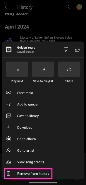 YouTube音楽に移動し、プロフィール写真をタップして、履歴を選択します。削除する曲の横にある楕円をタップして、「歴史から削除」を選択します。