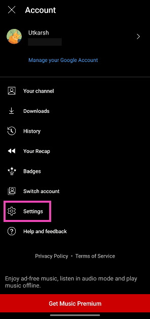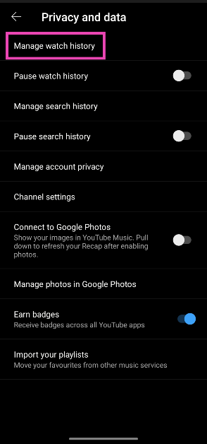 YouTube Music Appを起動し、プロフィール写真をタップし、「Watch History」に移動し、タップする削除>常に削除します。