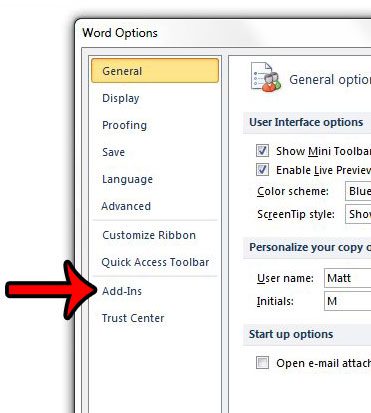 ステップ4:クリックしますアドインの左側の列のオプション単語オプションウィンドウ。