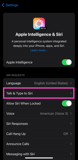 ステップ1:行きます設定タップしますApple Intelligence&Siri。