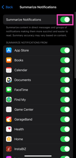 ステップ3:次のトグルスイッチをオフにしますプレビューを要約します機能を完全に無効にします。それを望まない場合は、下にスクロールしてトグルスイッチをオフにします要約された通知を受け取りたくないアプリ。