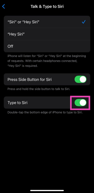 ステップ3:次のトグルスイッチをオフにしますSiriのタイプ。