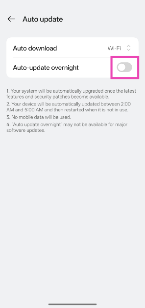 ステップ5:次のトグルスイッチをオフにします自動更新一晩。